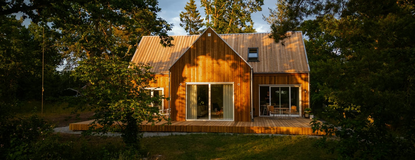 A cozy wooden hideaway surrounded by pine trees – where warmth meets simplicity.