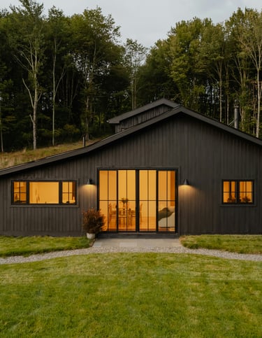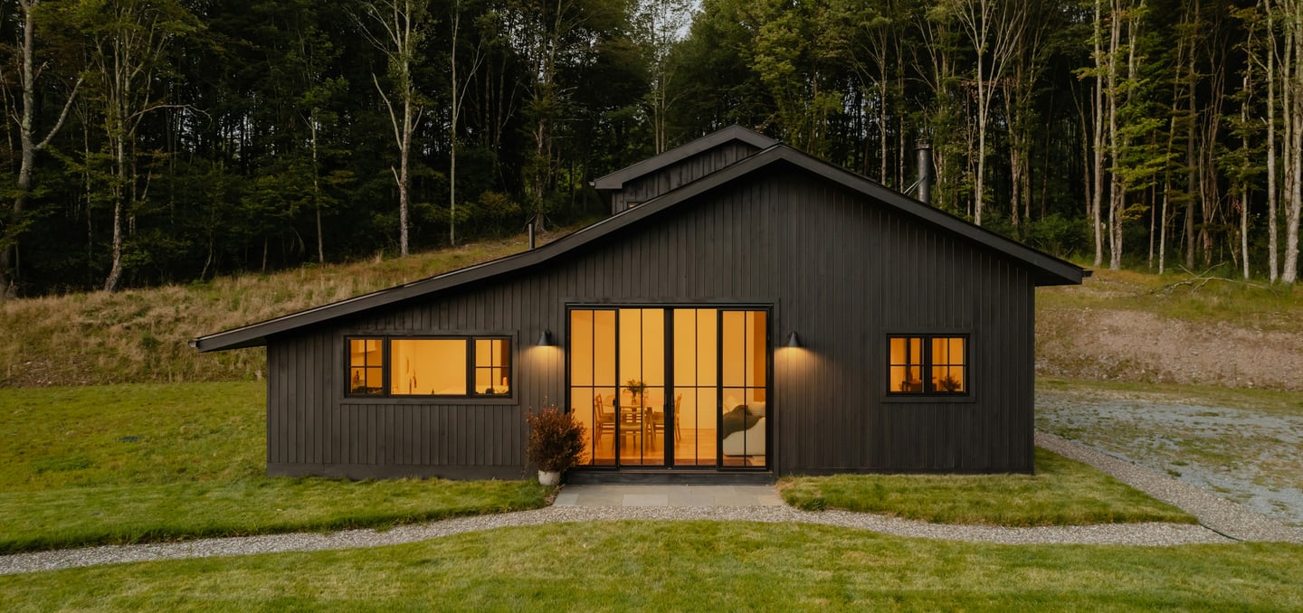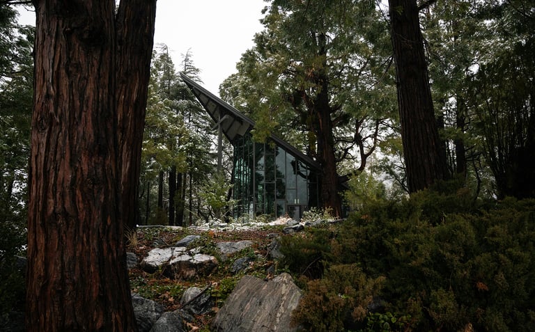 A minimalist cabin-in-the-woods hotel and restaurant surrounded by calm, light, and the scent of pine.